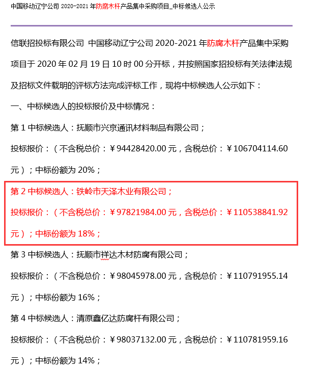 天澤木業(yè)在中國(guó)移動(dòng)遼寧公司最新防腐木桿采購(gòu)項(xiàng)目中中標(biāo)